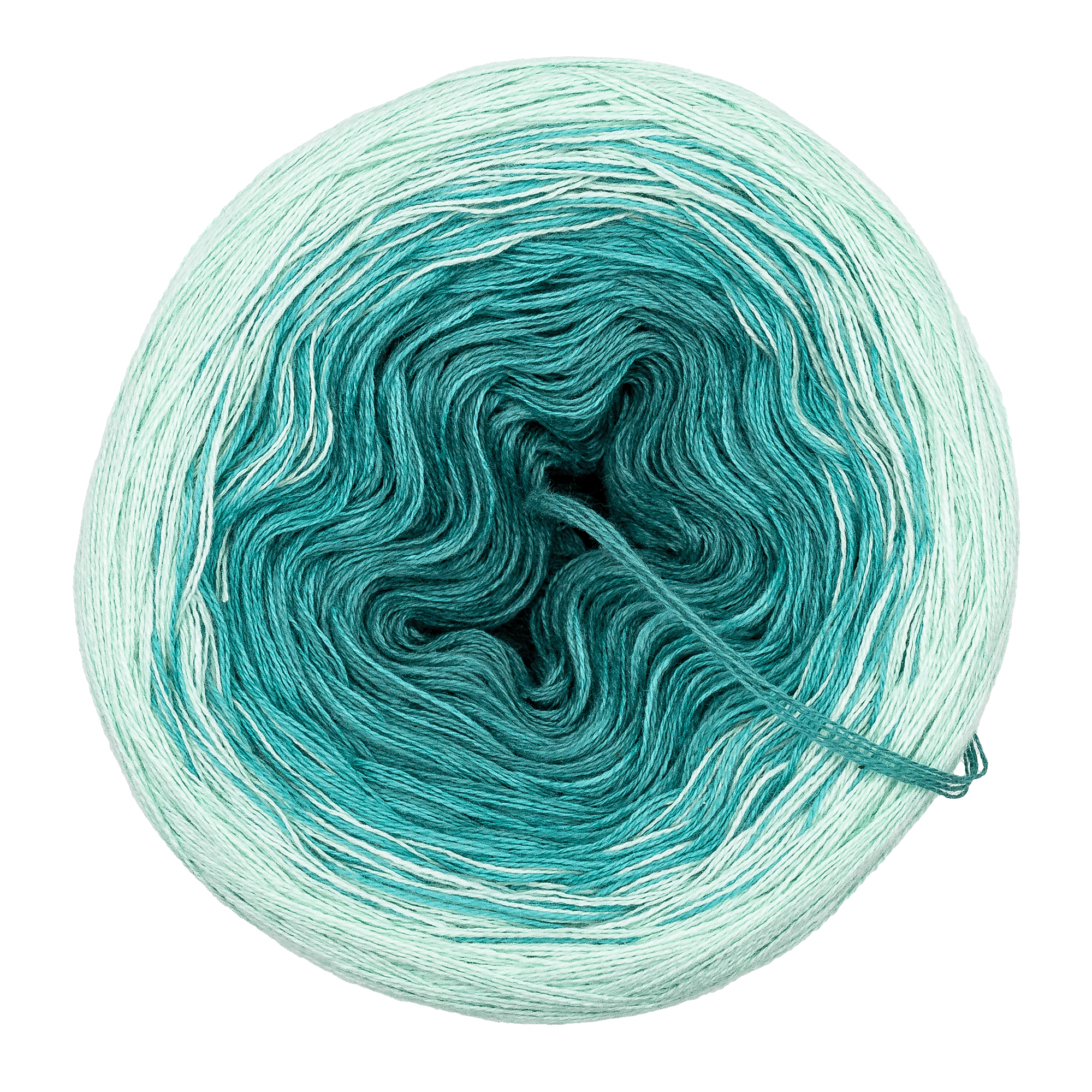 Die Farben sind mit Mini-Knötchen verbunden. Es wechselt immer nur ein Faden, sodass der Übergang fliessend und ein harmonischer Farbverlauf gegeben ist.